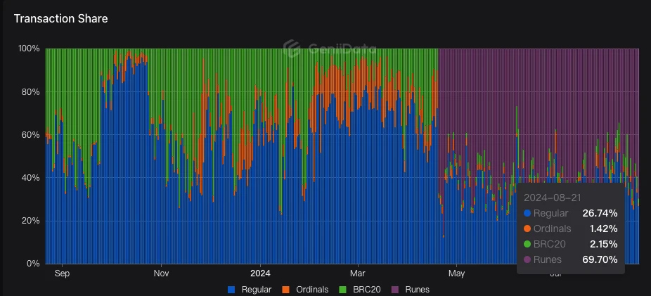 据 Geniidata 数据 , 8 月份以来符文依旧是比特币网络主要交易类型,平均有 50% 以上交易都属于符文,其次是常规的比特币交易,而 BRC-20 和 Ordinals 占整体交易份额总共不超过 10% ,并且符文的 持有地址总数 已经超过 BRC-20 。