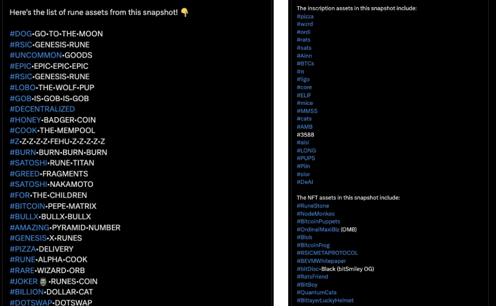 但最近 RGB 生态上两个项目也引起了众多玩家关注,一个是首个进行大规模空投的 RGB 20 代币项目 Jerry's box 。8 月 16 日其对一些符文、BRC 20 及比特币 NFT 持有地址进行了快照,如果持有其中资产之一便有资格获得空投,快照资产如下图。
