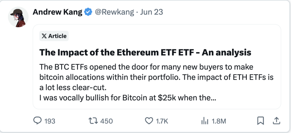 ETH ETF 的表现乏善可陈,看起来 @rewkang 的观点是正确的: