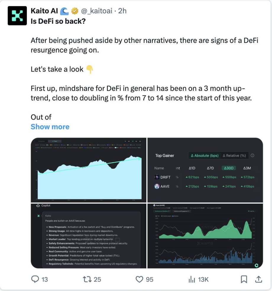 像 Coinbase 的 cbBTC 和 @VitalikButerin 支持的 L2 @megaeth_labs 这样的发展可能会刺激 DeFi 投机的新一轮,而 @babylonlabs_io 即将推出的主网可能会激发对更广泛的质押 / 重质押叙述的新兴趣。