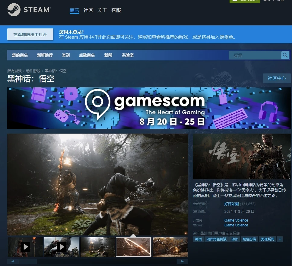 根据国游畅销榜统计,截至目前,《黑神话:悟空》在 Steam 上已售出超过 300 万份,加上 WeGame、Epic 和 PS 平台,目前总销量超过 450 万份,总销售额超过 15 亿元。当前,游戏 Steam 好评率维持在 95% 的水平,其中,中文评论占比约为 90% 。