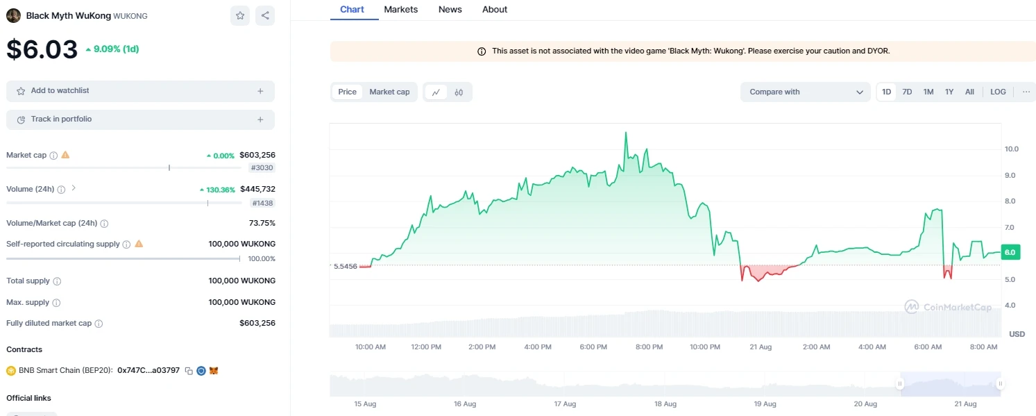 随着《黑神话:悟空》的高人气,WUKONG 迷因币也应声上涨,一度触及 10.67 美元高位,涨幅逼近 100% ,但随后回落至 6.03 美元。