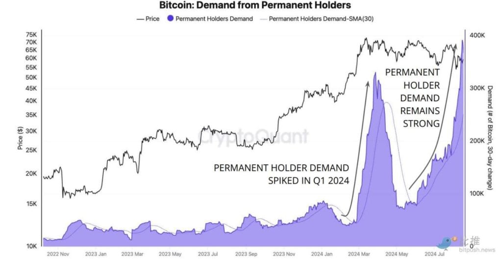 不过,市场面临的「夏季低迷」的一个例外是「永久持有者」—— 只𧹒入、从不卖出 BTC 的实体。