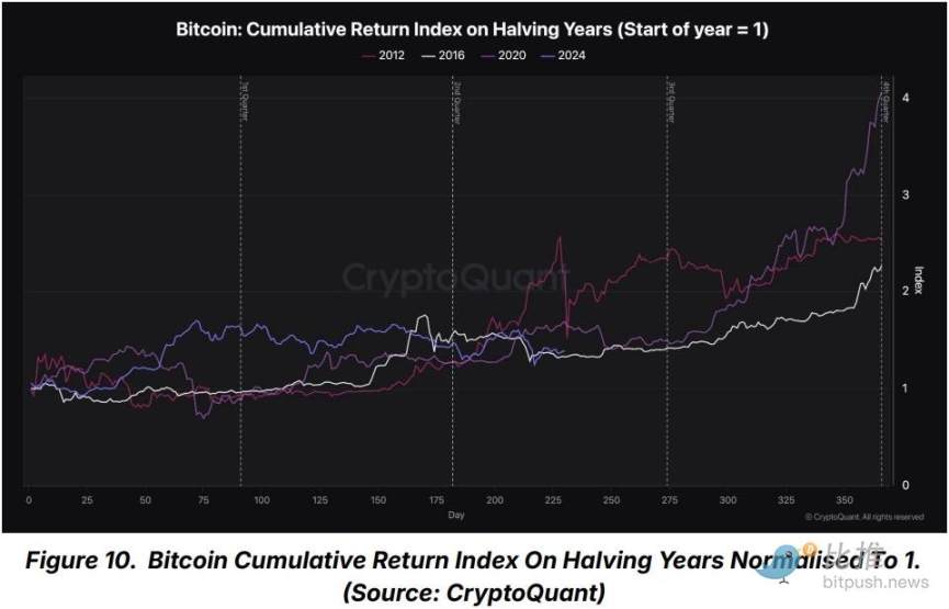 他们表示:「这些模式表明,减半后的周期通常会出现大幅反弹,即使之前出现短期下跌。截至 2024 年减半年的第 230 天(8 月 17 日),年初至今的标準化回报率为 1.38(38%)。」