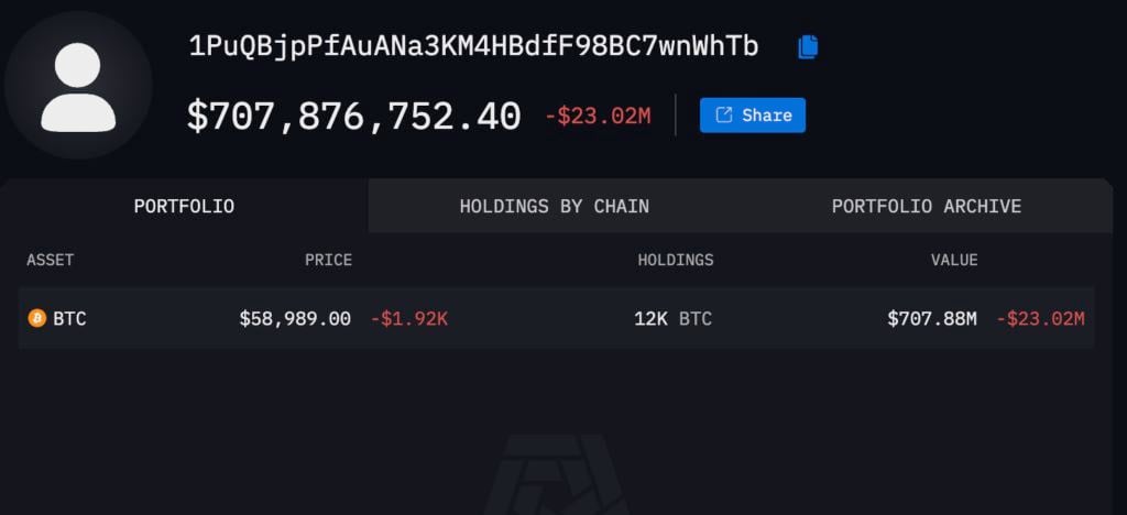雪上加霜的是,根据 Arkham 数据 ,Mt. Gox 地址于今日接近八点时,将 12,000 枚 BTC 转至一新地址,现价值约 7.07 亿美元。很可能又是为了还款所进行的转帐,将再次为市场带来卖压。