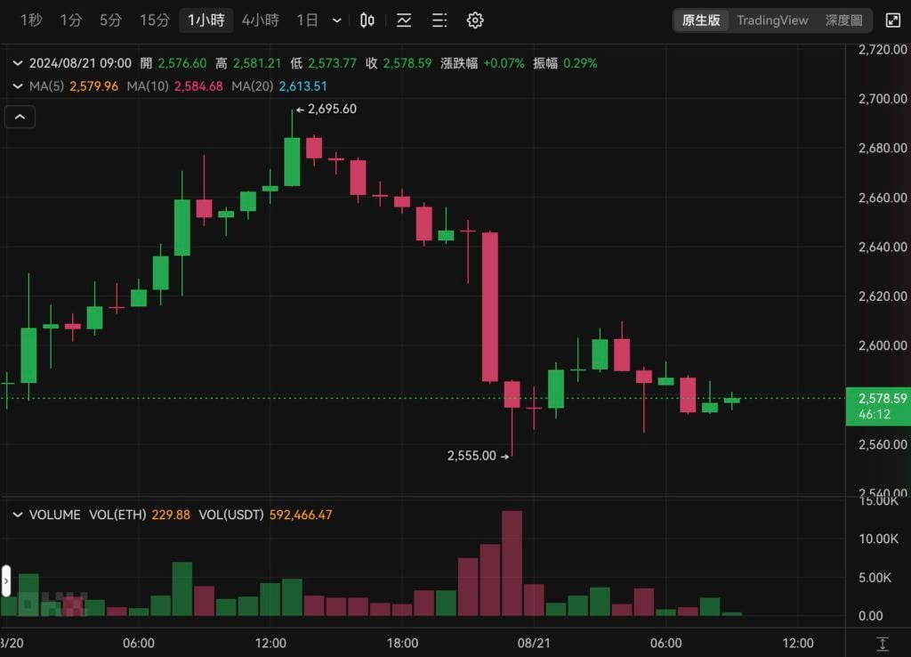 以太坊走势与比特币雷同,昨晚最低触及 2,550 美元,撰稿当下报 2,578 美元,近 24 小时下跌 3.31%,