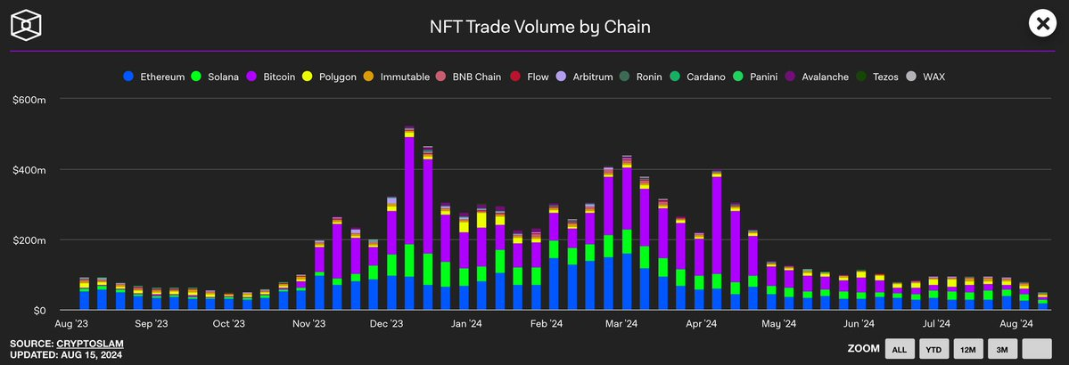 过去一年,比特币 NFT 市场经历了显著增长,尽管更广泛的 NFT 市场却在收缩。该领域正在成为比特币生态系统中一个显著的资产类别,形成了一个紧密的社区。