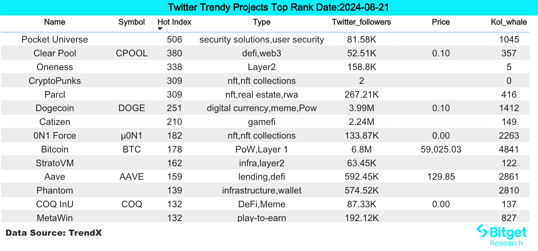 市场方面,本周将召开 Jackson Hole 会议, 9 月降息成为市场一致性预期,但是不排除还会出现避险回调的可能性。随着选举赔率的变化和略微有利的风险偏好环境,比特币可能会再次尝试向上突破。同时,稳定币的总市值已创下历史新高,达到 1650 亿美元。这一增长通常预示着比特币和加密货币价格的上涨。市场聚焦 TON 生态高流量 Telegram Mini Bot 项目 DOGS,目前已确定上线 Binance Launchpool。Solana 的 meme 币交易量急剧下降,随着 Sunpump 的上线,市场更多聚焦转移 Tron 生态 meme。