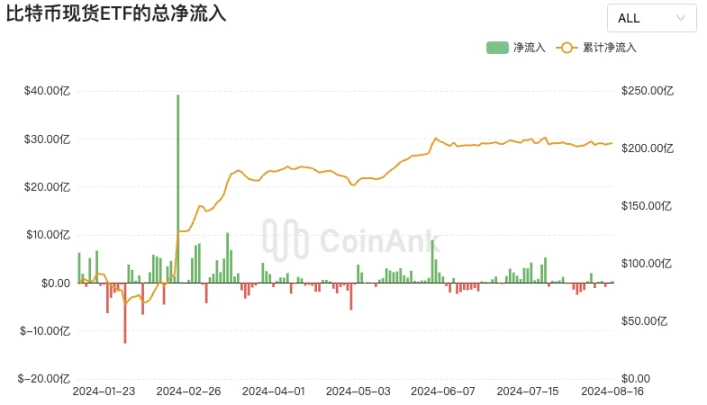 年初至 3 月初,累计净流入快速上升,表明市场对比特币现货 ETF 的需求旺盛。然而,随着时间的推移,特别是在 5 月以后,市场流入的资金减少,累积净流入开始趋于平稳,维持在 200 亿美元左右,未能再现之前的增长势头。我们可以看到,尽管偶尔会有较大规模的流入,但整体上净流入的幅度在 5 月以后有所减少,同时也伴随着一些净流出。这进一步佐证了市场情绪的变化,从积极买入转向更加观望和谨慎,「现货 ETF」对于带来新进资金的效应也衰竭了。