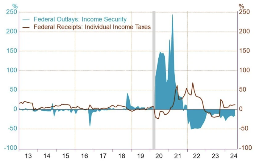 赤字——根据 CBO 的预测, 2025 年的初期赤字率预计将从 2024 年的 3.9% 下降至 3.1% ,但如果特朗普当选我们预计预计赤字率会增加至 4.1% (基于特朗普的关税政策,税收政策,移民政策,能源政策等),当财政继续加码会导致货币政策为了维持通胀率不断摇摆,同时也导致市场对债务的可持续性担忧加重,对于我们判断未来市场走势非常不利。