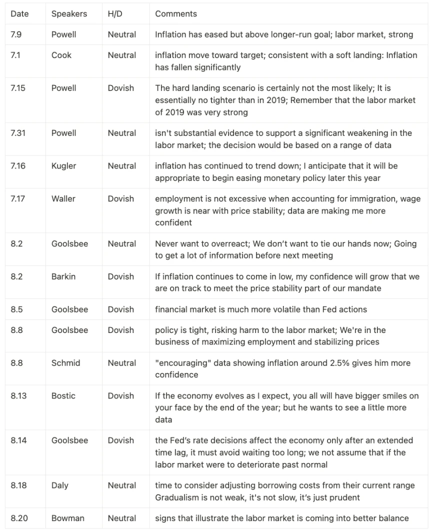 美联储动向 :美联储官员发言显示政策调整谨慎, 9 月点阵图预计将继续保持宽松立场。