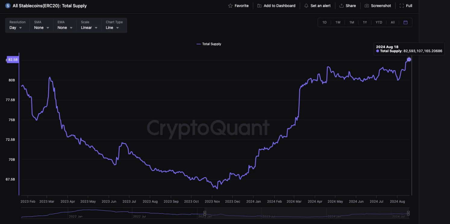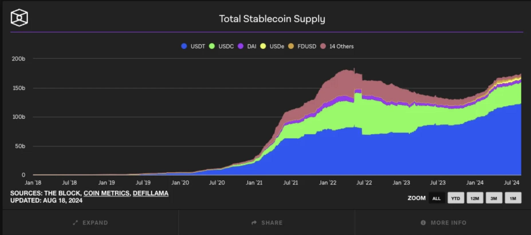 近期稳定币供应量在放缓之后重新进入增发阶段,已经创下了这轮上涨周期的新高。总体而言, 2024 年的稳定币市场仍处于增长态势,对于低迷的行情也应该有相应的提振作用。