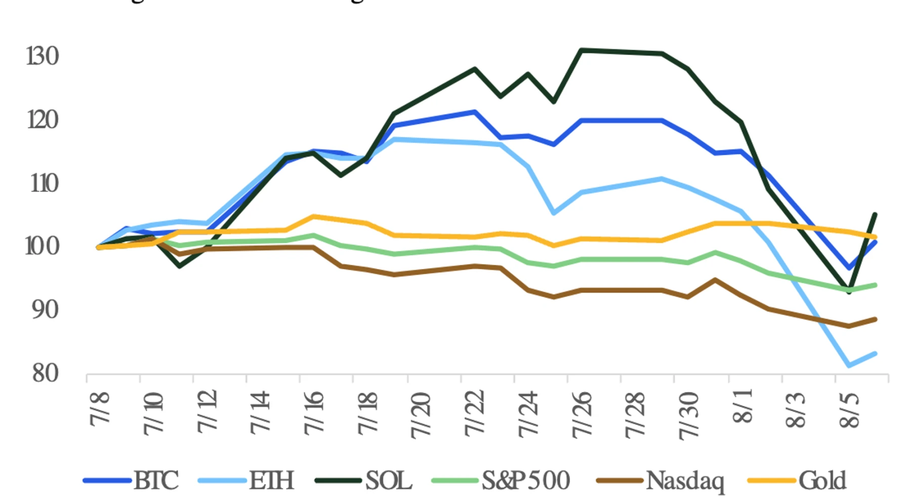 日本央行意外加息导致东证指数在一天内下跌 20% ——投资者恐慌性抛售回补头寸。由于经济衰退风险上升以及人们担心日元大幅波动将引发更广泛的去风险化,股市在几个交易日内大幅下跌。