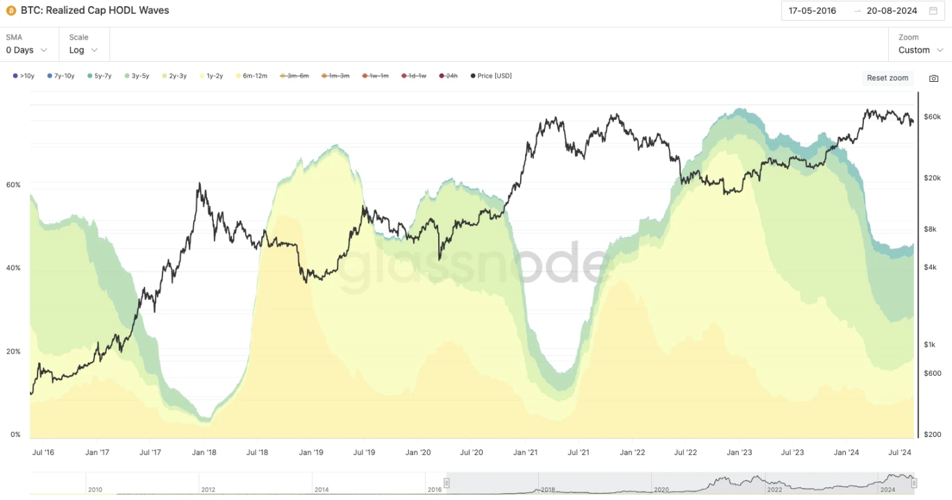 这代表着,目前的链上情况是长线持有者 的占比依然较高,这表明尽管价格波动,许多投资者选择继续持有比特币而不是出售。