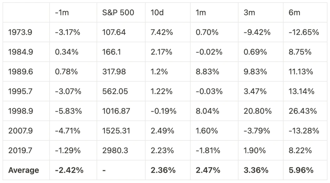 本月 S&P 500 很可能收涨结尾,在过去的历史里降息(73 年 -Now)前收涨的比较罕见,只有 84 年和 89 年,并且在降息后的 1 m, 3 m 和 6 m 内都没有得到大幅回调。( 但是由于数据量较小,对此次降息后的市场走势判断有限,仅供参考 )。