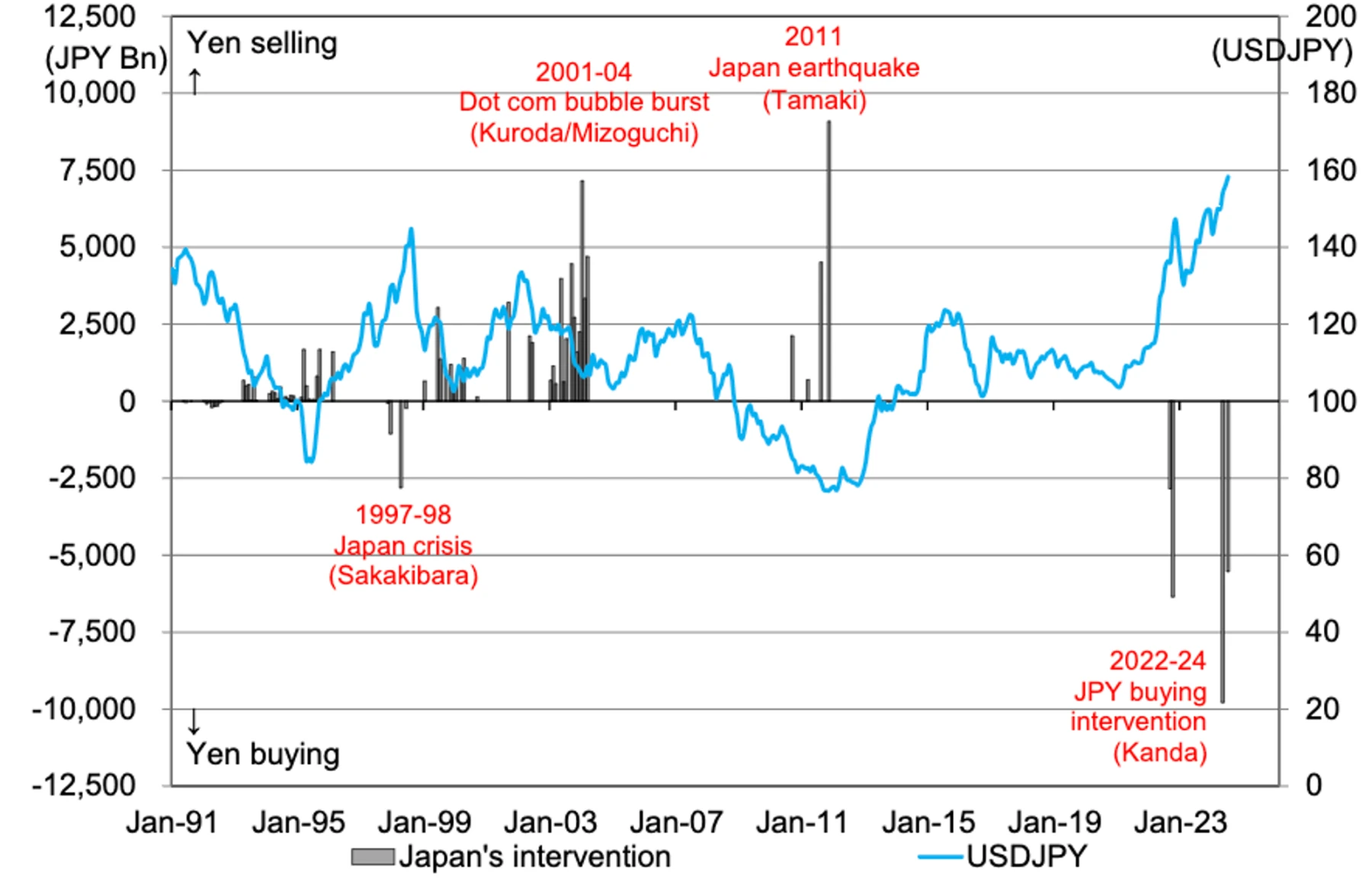 过去四周,美元兑日元大幅下跌,从近 162 日元 / 美元跌至 142 日元 / 美元左右,与我们的看跌预期一致。此次大幅下跌是由日本央行加息以及日本政府在 7 月 11 日和 12 日干预购买日元引发的。虽然有些人怀疑外汇干预的有效性,但我们支持其通过改变供需来改变市场趋势的能力。