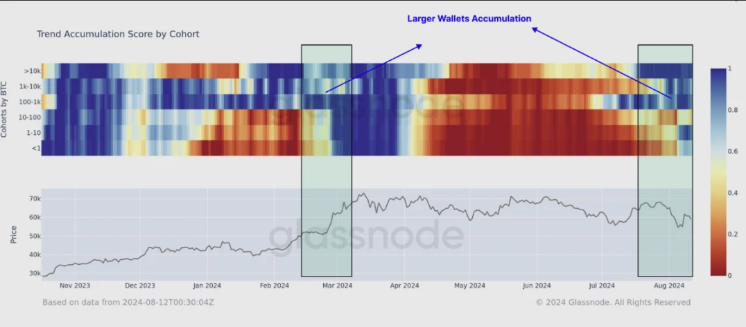 这张图表展示的是比特币不同持仓规模群体的「趋势积累分数」(Trend Accumulation Score)随时间的变化情况,颜色越蓝代表着链上持币者倾向于持有或者买入, 越红代表着投资者越倾向于卖出。