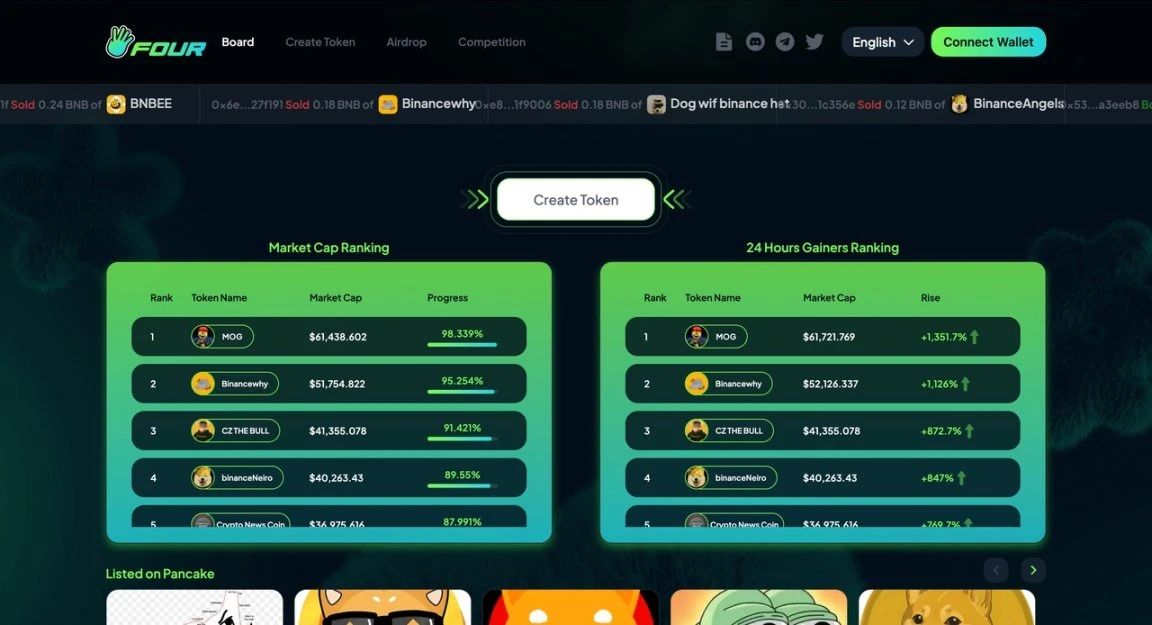 Four.meme 作为 BNB 链上的发行平台,从项目名称到品牌 LOGO 都能看出与 BNB 的关联,其化用了 CZ 的经典手势「Four」。此外, 4 chan 作为 Memecoin 在 Web 2 的发酵平台或许也影响了 Four.meme 的品牌名。不论是从团队创始人发言还是各类活动来看,Four.meme 都获得了 BNB Chain 不小的助力。其与 FOUR 代币合作推出空投活动,用户在平台指定页面完成相关任务即可获得积分,积分可兑换 BNB Chain 生态 Meme 币 FOUR 和 WHY。该活动获得 BNB Chain 支持和转发,受此消息影响,FOUR 在 24 H 涨幅超 65% 。8 月中,Four.Meme 开始举办 Meme 创建大赛,总奖池包括 100 万个 Four.Meme 积分和价值 2 万美元的 Meme 代币,邀请到了 In 2 Ventures 创办人 Bili、NBA 明星 Tristan Thompson、WHY、FOUR 团队,作为裁判嘉宾。