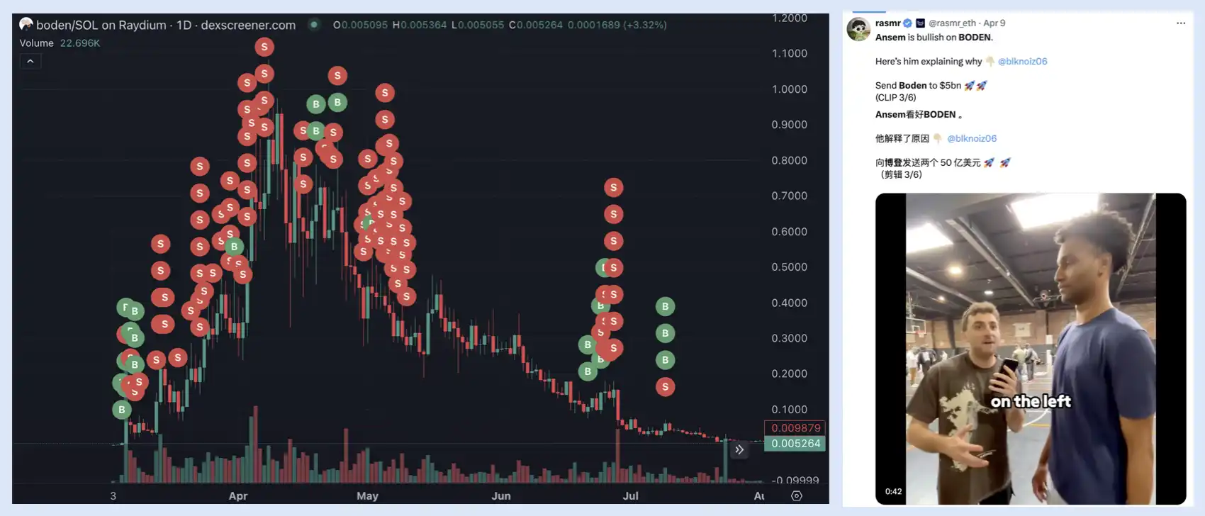 左图:Dexcreener 显示的 Ansem 公开钱包地址在 $boden 上的交易记录;右图:社区关于 Ansem 购买了 $boden 的讨论