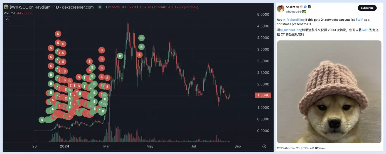 四个多月后,WIF 最高触及 4.9 美元,距离 Ansem 首次买入成本价格相差了近 16000 倍。Ansem 也因为对 WIF 的埋伏成为了 Solana 社区的传奇交易员、金手指 caller。