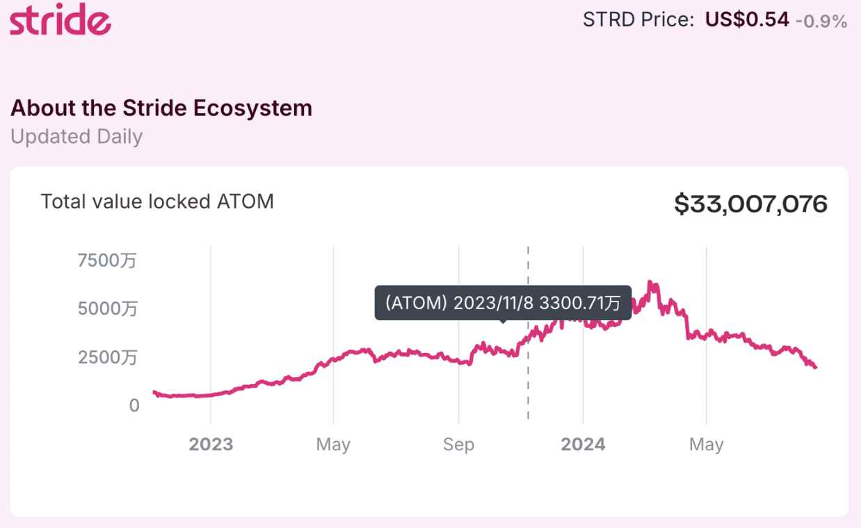 下图为 stATOM 在 Stride 中被铸造的锁仓价值。可以看到,从 9 月 13 日以来,stATOM 被铸造的锁仓价值显著提高,随后到 4 月 8 日峰值后开始下降。虽然是下降趋势,但对比在此阶段下跌的 ATOM 的价格,其锁仓的 ATOM 数量应当并未下降很多,但增长率应当有所下降。