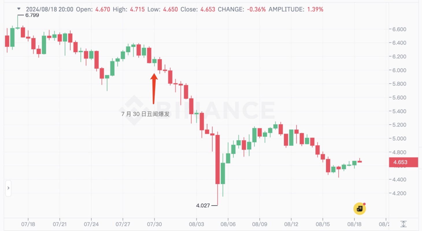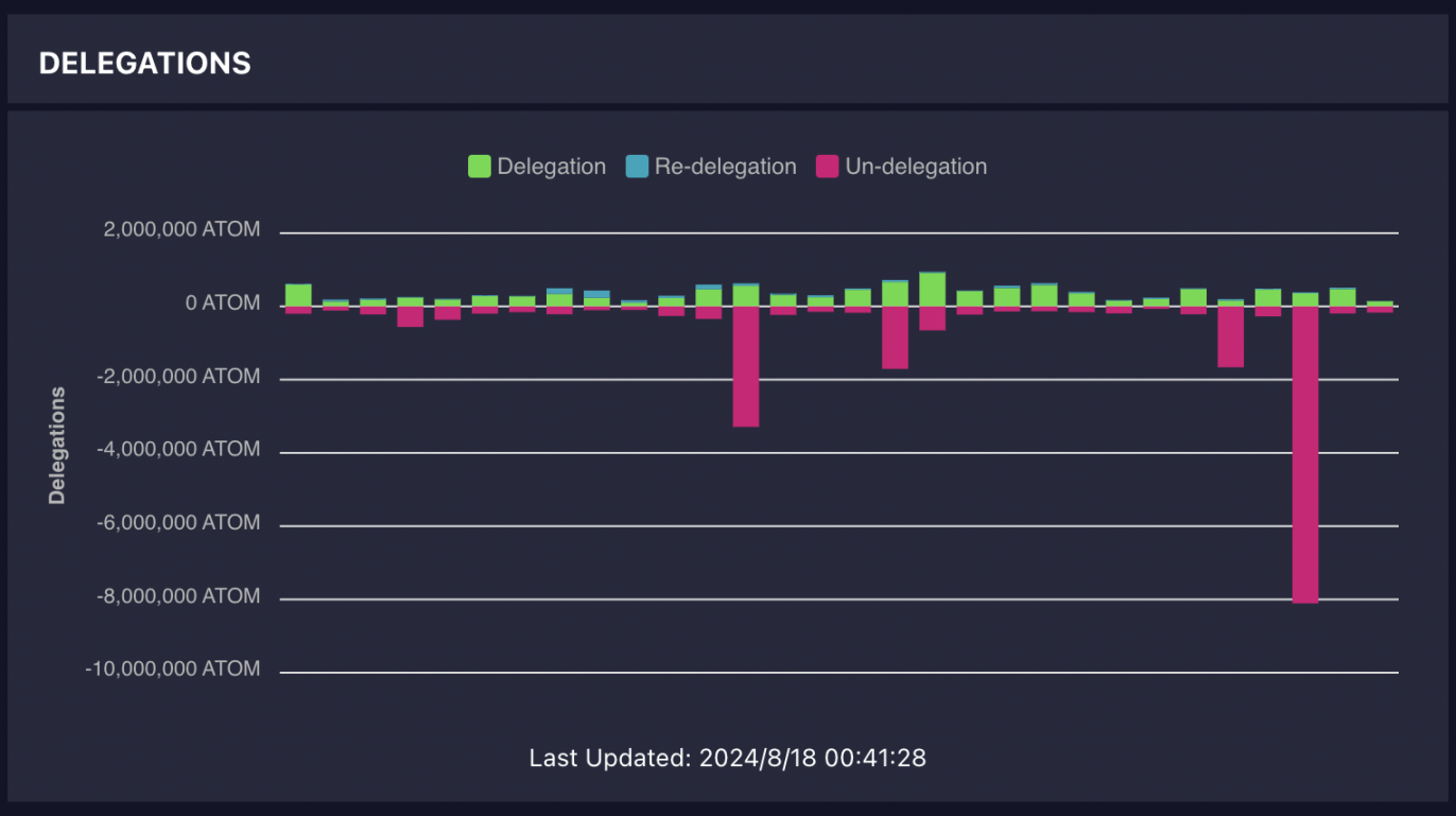 从质押的数据来看,惨不忍睹。自 7 月 31 日爆出 Cosmos 治理腐败的丑闻后,Cosmos 开始出现巨额解质押。7 月 31 日解质押约 330 万枚 ATOM、8 月 4 日解质押约 170 万枚 ATOM,8 月 5 日解质押约 65 万枚 ATOM,8 月 13 日解质押约 166 万枚 ATOM,8 月 15 日解质押约 810 万枚 ATOM。这几日共解质押 1211 万枚 ATOM,占 ATOM 流通量近 3%。ATOM 币价也从 7 月 31 日的 6.15 美元跌至 8 月 18 日的 4.62 美元,跌幅达 33%。