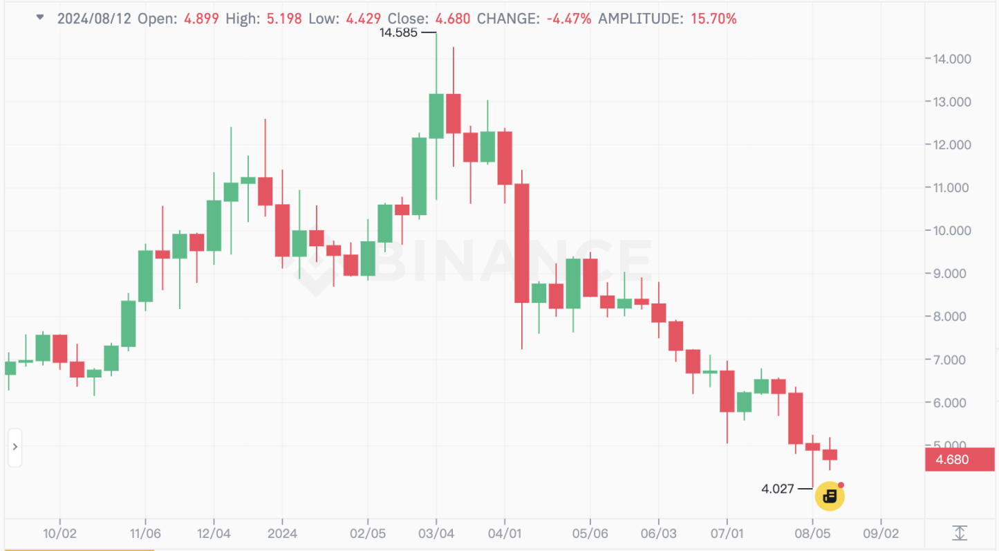 Quicksilver 在初始阶段走势不错,但由于后续 TVL 迟迟上不去,币价随之表现也极度拉胯。