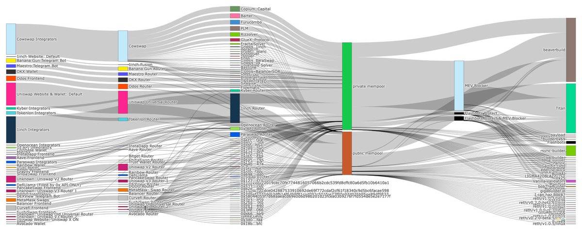 在更细致的分析中,你会发现大部分私人订单流来自聚合器(如 1inch)和前端工具(TG 机器人、钱包和前端)。
