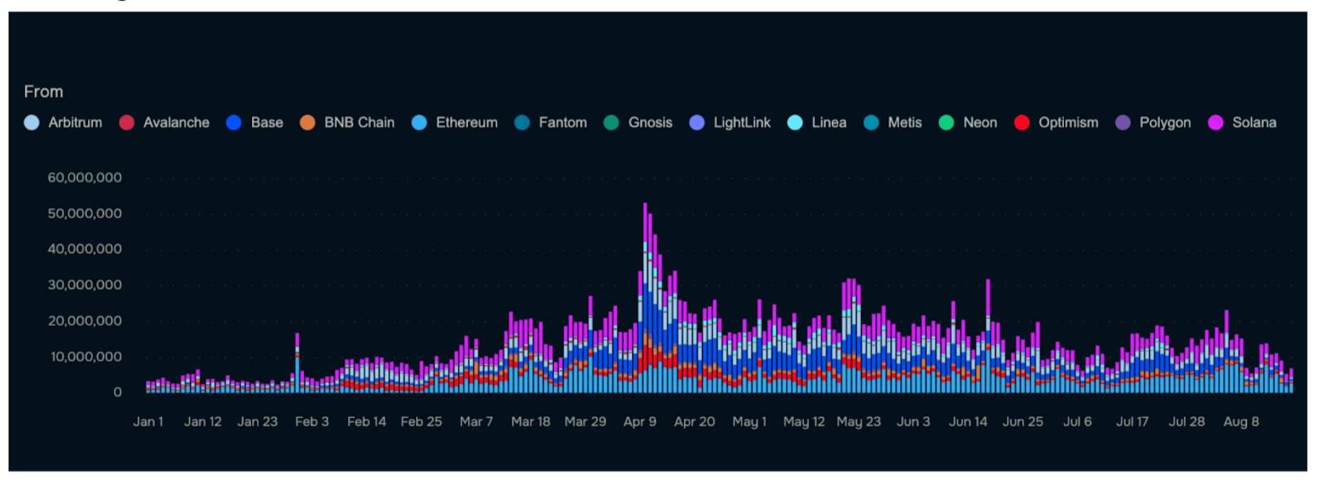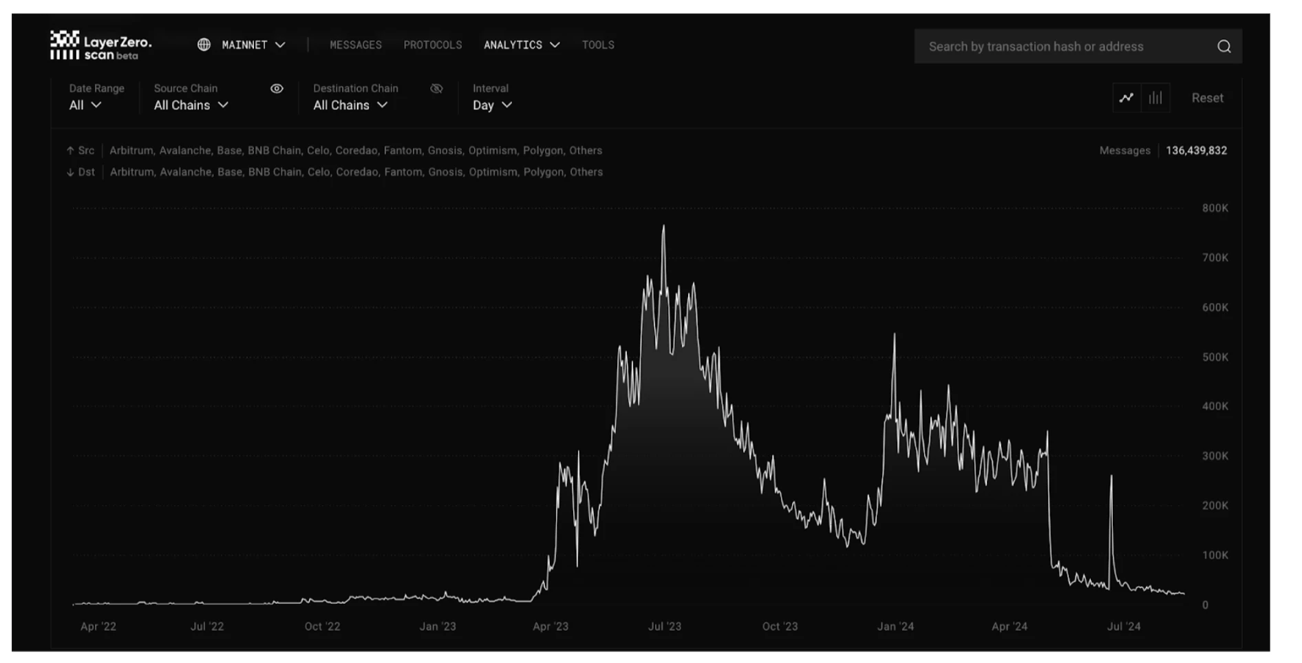 从图表中可以看出,deBridge 在较长时间内保持了稳定的交易量,且在市场整体波动时,交易量的波动相对较小。相比之下,LayerZero 的交易活动在几个高峰期后出现了显著的下降,表明其交易活动可能更容易受到市场变化的影响。