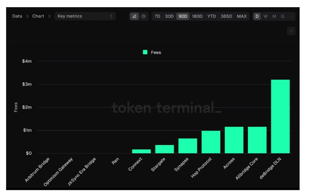 该图表展示了过去 90 天内各跨链桥接协议的费用收入情况,其中 deBridge 的 DLN 产品显著优于其竞争对手。DLN 的费用收入超过 300 万美元,远超排名第二的 Altbridge Core。其他知名协议如 Synapse 和 Stargate 的收入显著较低,突显了 DLN 在跨链桥接领域的主导市场地位和强劲的增长潜力。