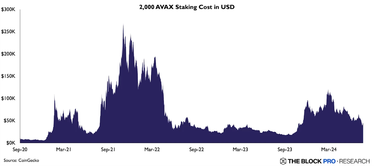 在网络成立之初,这一质押要求并不高。然而,由于多年来代币的升值,在之前市场的顶峰时期达到了 25 万美元以上,如今相当于 4.1 万美元。这种高昂的总体运营成本阻碍了 Avalanche L1验证者集的去中心化,从长远来看,可能会妨碍 Avalanche 生态系统的可靠性和采用。