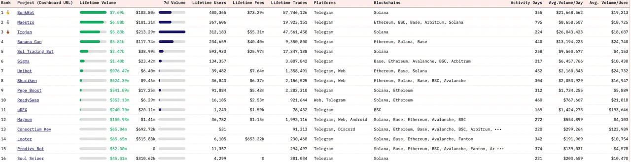 通过对 Dex Trading Bot 交易量排名的分析发现,排名前三的 Dex Trading Bot 项目(Photon、Bonkbot 和 Trojan)占据本链交易份额的 90% 以上。