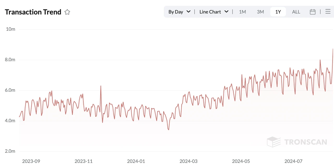 Tron网络上的每日交易数量呈现出强劲的增长趋势,特别是 2024 年以来,增长更为明显。这可能反映了 Tron 生态系统的扩张、用户采用率的提高。在 2024 年 7 月至 8 月期间,交易量达到了新高,多次突破 8 百万笔,最高点接近 9 百万笔。这得益于 Meme 代币炒作热潮开始延伸至 Tron 公链。