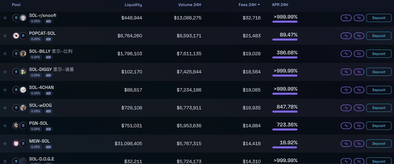 Raydium 作为 Solana 生态系统中最大的去中心化交易所,近 30 天内产生 5237 万美元的交易费用,图 2-3 数据统计显示其收入主要来源于 Meme 币交易对,凸显了投机性 Meme 币交易在当前 Solana DeFi 市场中的主导地位及其对平台收入的显著贡献。