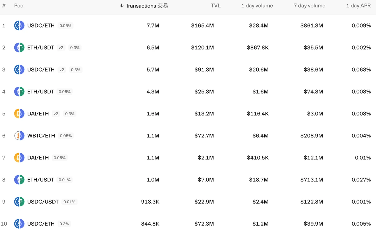 Uniswap 在近 30 天内的收入是 5423 万美元,其中贡献燃烧的 Gas 费是 815 万美元,在 Ethereum 生态中占比约为 17.3% 。统计数据(图 1-2)显示,Uniswap 交易量排名前列的交易对主要由 ETH 与稳定币组成,投机性较强的 Meme 代币交易在整体交易构成中占比极低,这一现象凸显了平台上以正常交易行为为主导的健康生态。