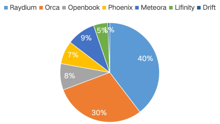 图中 2-2 数据显示,Raydium 和 Orca 占比达到了 70% ,成为了 Solana 链上活动的主要发生地。
