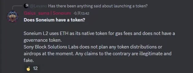 A8 :暂不确定。根据社区截图显示,社区管理员称,Soneium 将使用 ETH 作为其 L2 网络的 Gas 费用,暂无发行原生代币、代币空投等计划,但该内容目前已删除。
