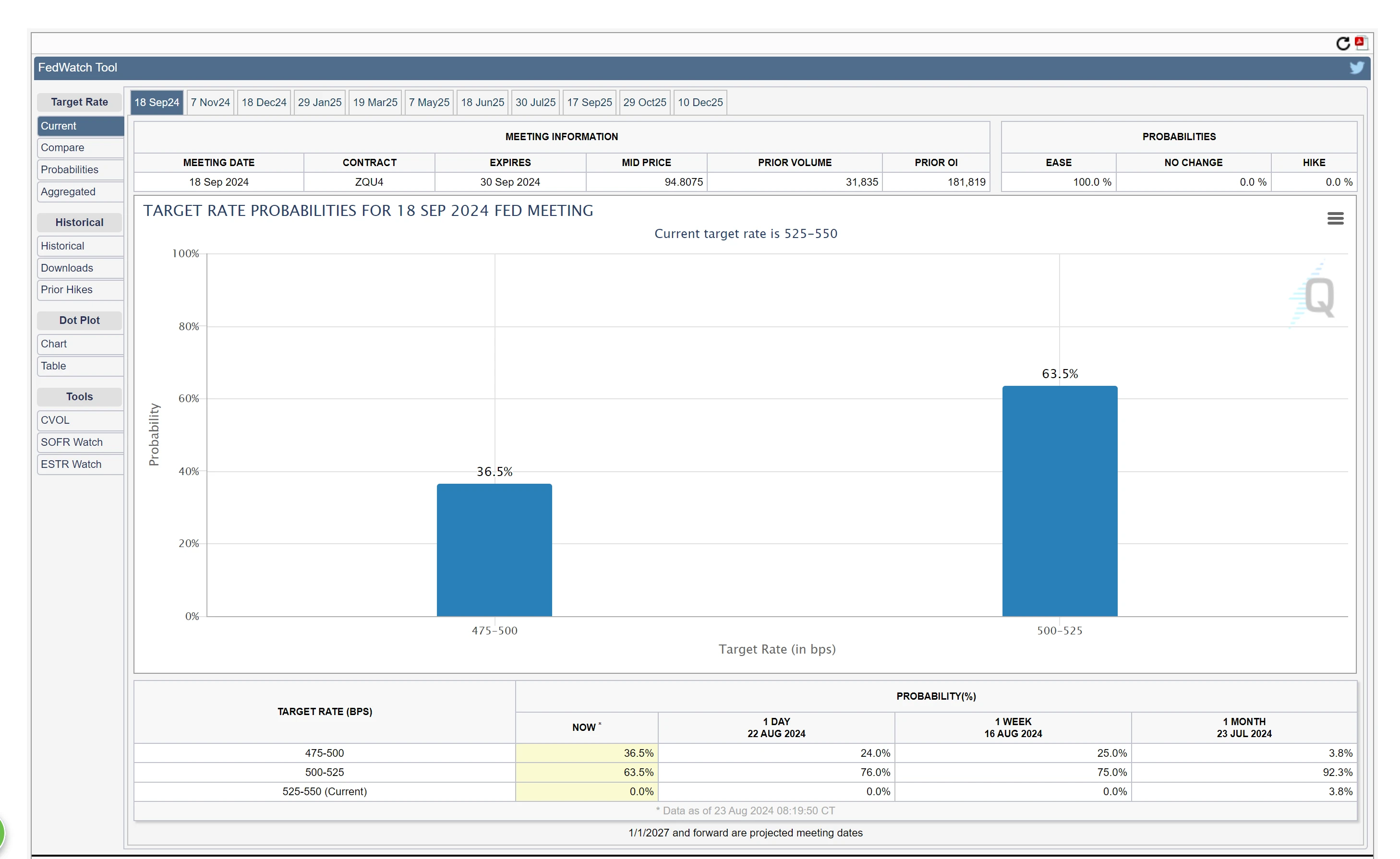 接下来的问题是美联储是否会在 9 月中旬的会议上将联邦基金利率下调 25 或 50 个基点。市场继续倾向于下调 25 个基点,但根据 CME FedWatch 的数据,下调 50 个基点的可能性已从一天前的 24% 升至目前的 32.5% 。从现在到 9 月做出决定之间,还有一些关键的经济报告——其中包括 8 月份的就业和通胀数据——这应该是美联储最终决定的关键。