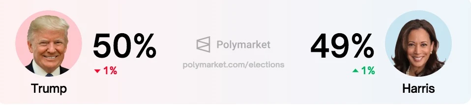 Polymarket 美国大选的获胜概率数据显示,特朗普和哈里斯的概率不分上下,截止发文,特朗普以 1% 的微弱优势领先于哈里斯。