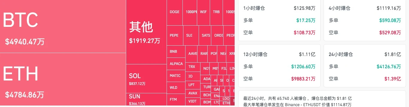 衍生品交易方面,Coinglass 数据显示,过去 24 小时全网爆仓 1.81 亿美元,其中绝大部分为空单爆仓,数额达 1.39 亿美元。从币种来看,其中 BTC 爆仓 4940.47 万美元,ETH 爆仓 4784.86 万美元。
