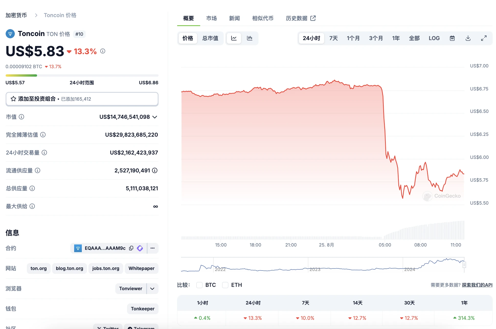 截止撰稿时,据 Coingecko 数据 显示,TON 代币价格下跌至 5.83 美元, 24 小时跌幅达 13.3% ,市值目前为 147.4 亿美元,仍位列加密货币代币市值排名第十的行列;DefiLlama 数据 显示,TON 网络 TVL 已从 7 月 21 日的 7.7 亿美元下跌至如今的 3.04 亿美元左右,生态 TVL 减少超 50% , 市场避险情绪强烈。