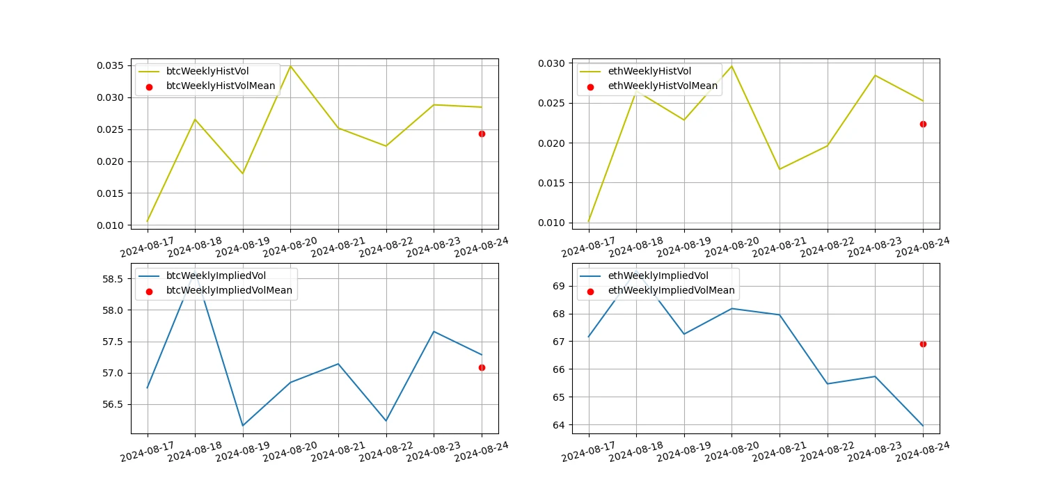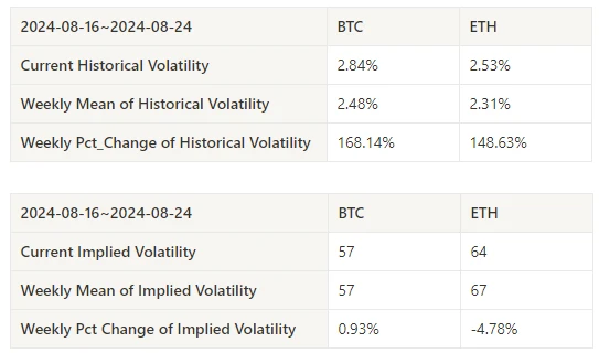 过去一周历史波动率 BTC 与 ETH 在 8.20 宽幅震荡时最高;隐含波动率 BTC 上升而 ETH 都下降。