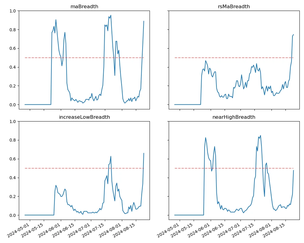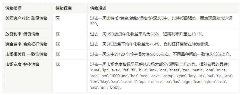 过去一周选中的 129 个币,价格在 30 日均线上方的占比为 89% ,相对 BTC 价格在 30 日均线上方占比为 75% ,距离过去 30 天最低价大于 20% 的占比为 66% ,距离过去 30 天最高价小于 10% 的占比为 48% ,过去一周市场宽度指标显示整体市场大部分币回到上升态势。