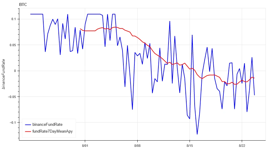 蓝色线为币安上 BTC 的资金费率,红色线为其 7 日平均
