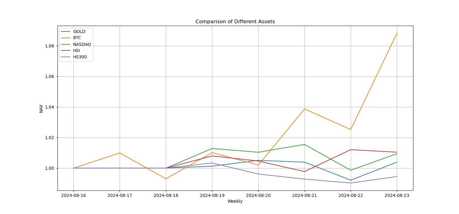 过去一周比特币/黄金/纳指/恒指/沪深 300 中,比特币最强势,而表现最差为沪深 300 。