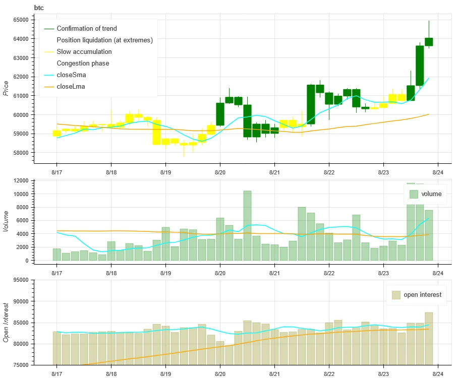 上图最上方 BTC 的价格走势,中间是成交量、最下方是未平仓量、浅蓝色是 1 天均值,橘色是 7 天均值。其中 K 线的颜色代表当前的状态,绿色是价格上升有成交量支持,红色是在平仓,黄色是在缓慢累积仓位,黑色是拥挤状态。