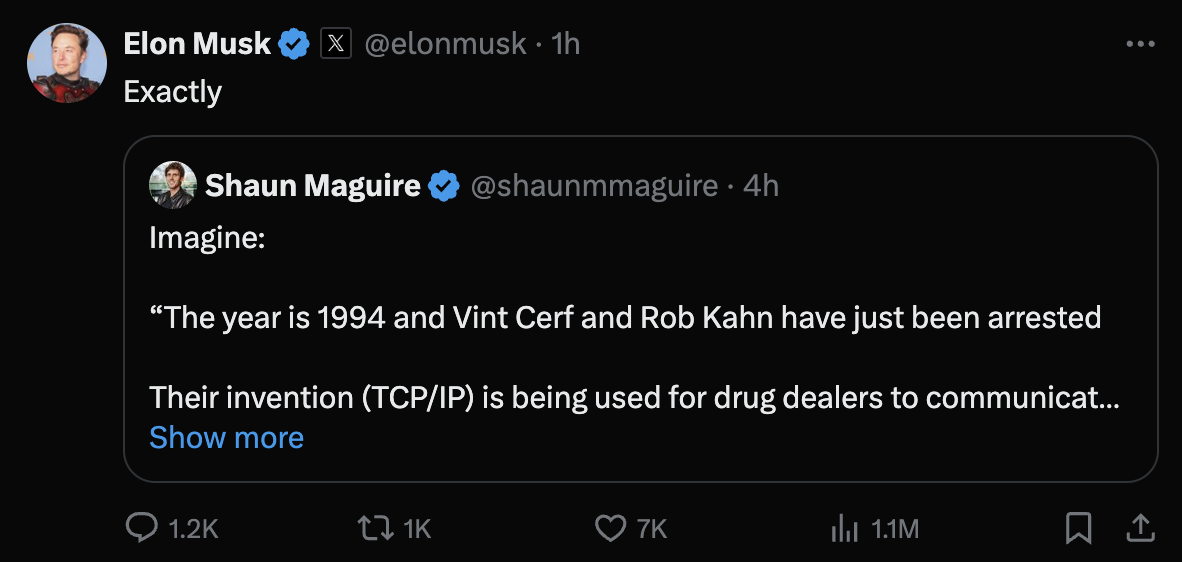 另外,马斯克也转发了一则贴文并表示认同,这则贴文试想 1994 年 Vint Cerf 和 Bob Kahn(TCP/IP 协议的共同发明者)被逮捕的假想情况,TCP/IP 是网路的核心协议,当年 Cerf 和 Kahn 创造了这个协议,但假设他们如Pavel Durov 相同,他们同样因为不𫖸意在系统中安装政府后门,而被指控他们的发明被用来进行非法活动(例如毒贩通讯),这将会阻碍全球的网路发展,并极具争议性。