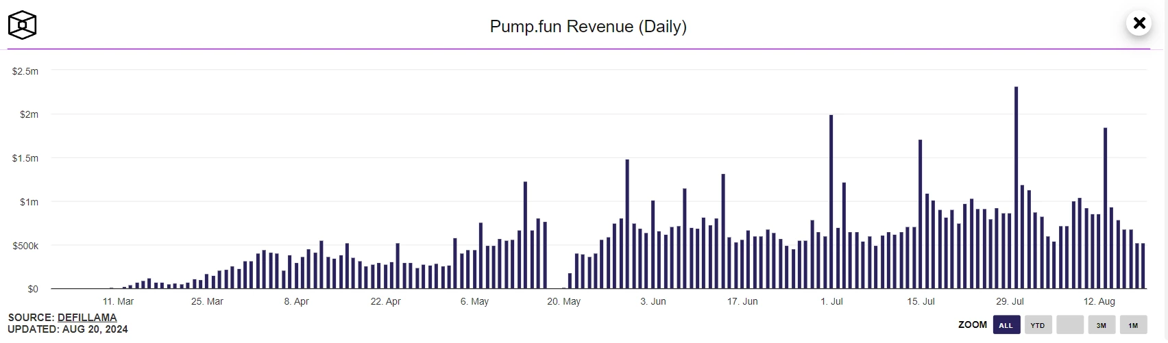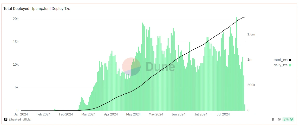 这个我们来看一下 Pump Fun 的数据从市场数据来看,Pump Fun 的受欢迎程度不断攀升。自今年 3 月以来,其日部署量持续增加,到 8 月份甚至达到了惊人的 182 万。这表明存量资金对于以小博大的投资模式仍然充满兴趣,尽管能成功从 Pump Fun 到 Raydium 的案例只有九牛一毛。