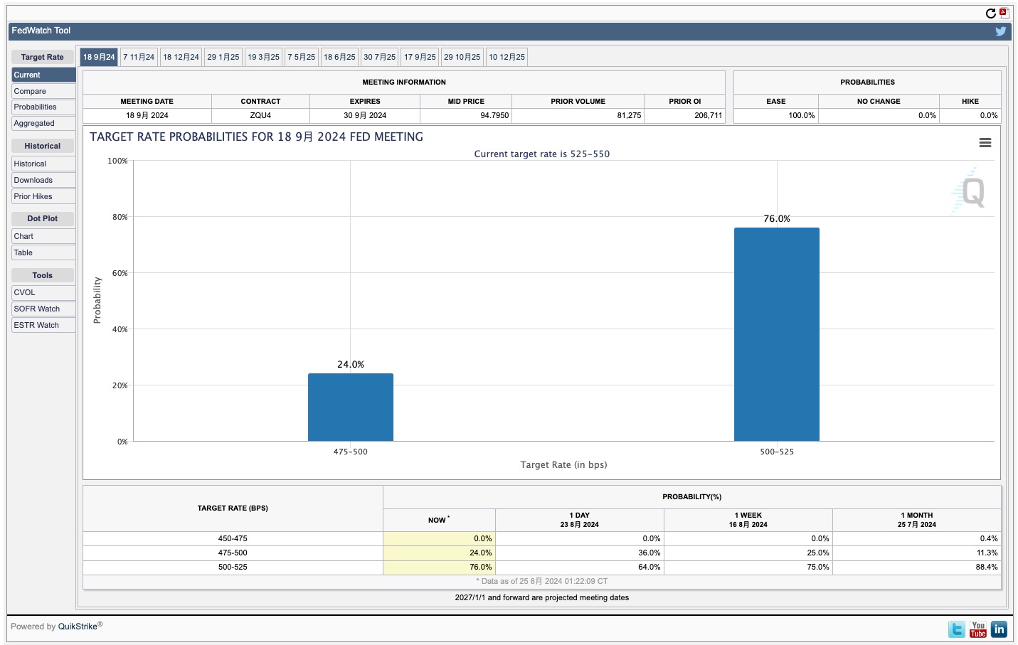 当前市场对9月利率决策的预估是将近75%的概率降25~50BP,25%的概率降50~75个BP,那么密切关注市场的判断,也可以较为明显的判断市场情绪。