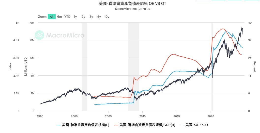 自从2008年金融风暴后,美联储快速将利率降低到0,但是仍然没有能够让经济出现复苏的现象,那时货币政策已经失效,因为无法继续降息,于是为了向市场进一步注入流动性,美联储创建了量化宽松QE工具,通过扩张美联储的资产负债表的方式向市场注入流动性,同时增加银行系统的准备金规模。这种方式其实是将市场风险转移到美联储身上,因此为了降低系统性风险,美联储需要通过量化紧缩QT,控制资产负债表规模。避免无序的宽松导致自身风险过大。